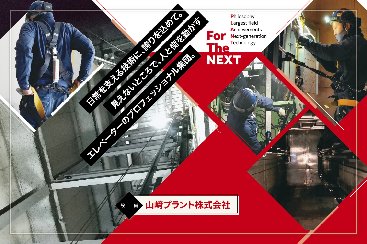 私たちが手がけているのは、単なる「設備工事」ではありません。工場で使われる大型機械や、街の高層ビルで毎日使われているエレベーターなど、社会に欠かせない設備の“心臓部”を支える重要な仕事です。こうした仕事を、専門技術を持ったチームで、安全かつ正確にこなしていく――それが山崎プラントの使命です。