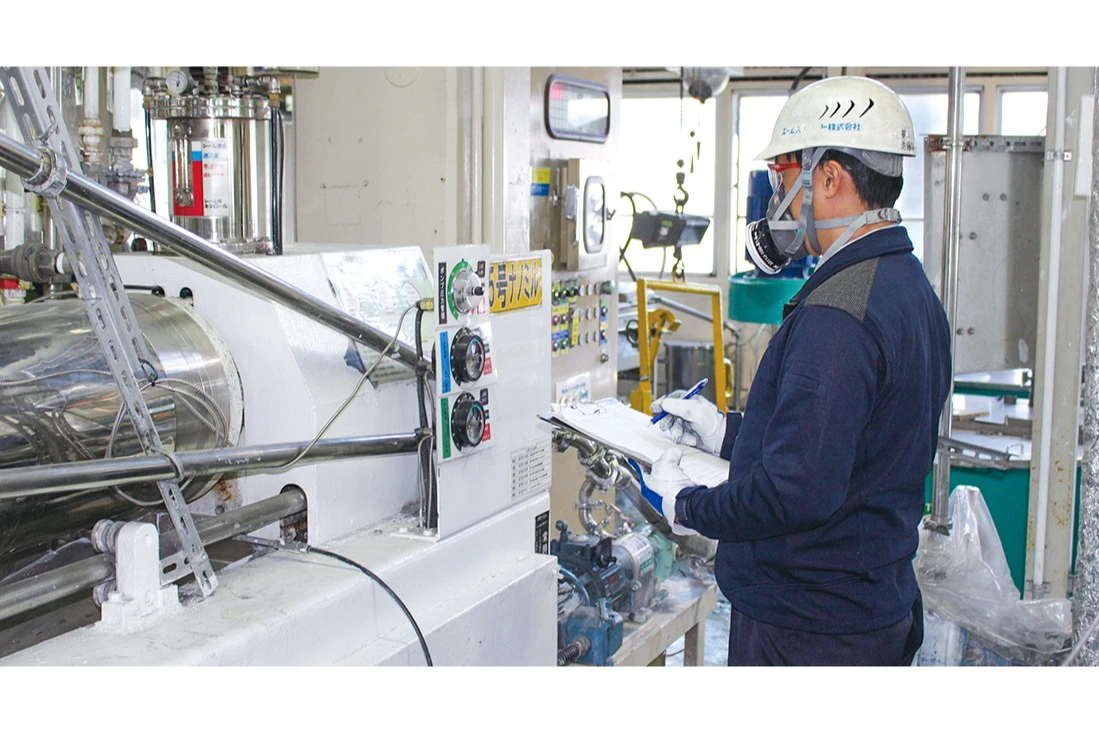 作業手順書を基に、原料収集→仕込み→分散→溶解→充填の各工程を各担当者が行います。