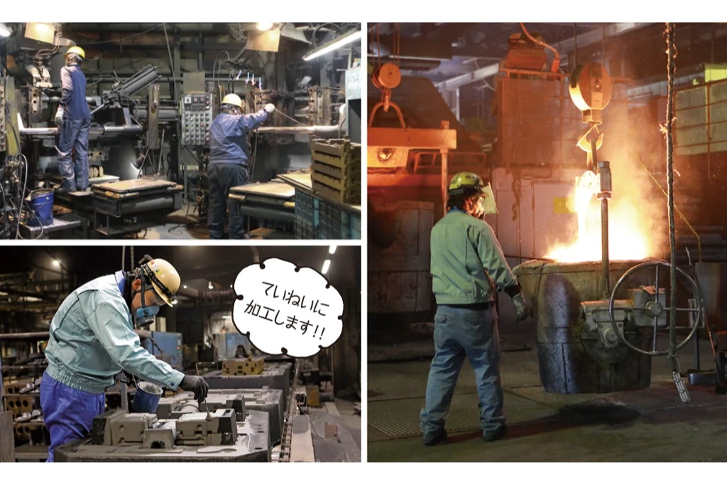 私たちの会社では、農業機械や発電機などのエンジンに使われる「銑鉄鋳物(せんてついもの)」を製造しています。鉄を1,500度以上の高温で溶かし、専用の型に流し込んで冷やすことで、頑丈で長持ちする部品を作ります。「自分が作った部品が、世界中の機械を動かしている」そんなやりがいを感じられるのが、私たちの仕事です。