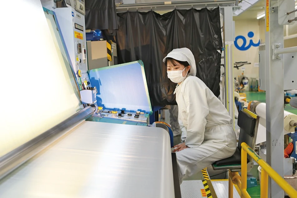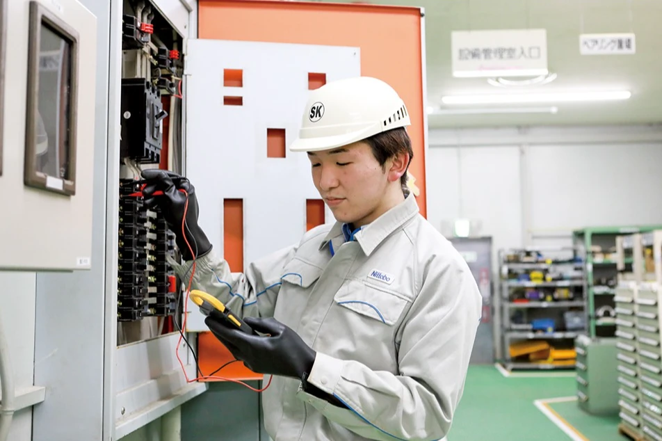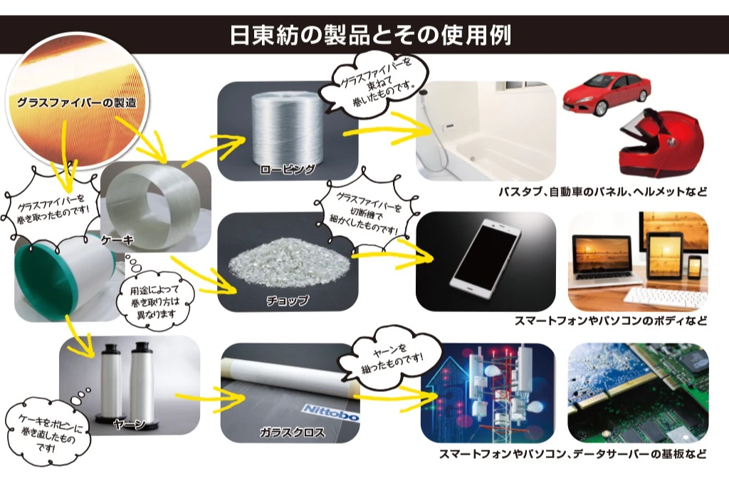 日東紡福島事業センターは主にグラスファイバーと呼ばれるガラス繊維の製造をしています。ガラスを1300℃以上の溶融炉で溶かし、繊維状にすることでグラスファイバーは作られますが、硬くて丈夫というガラスの特性を備え、しなやかでありながら引っ張る力に強く、強度は金属製のピアノ線以上。加えて電気を通さない、燃えにくいなどの性質もあり、さまざまな用途に使用されます。例を挙げるとスマートフォンやネットワークサーバーの基板からバスタブに至るまで、身近なものから時代の最先端を担うものまで幅広い分野でグラスファイバーが用いられています。