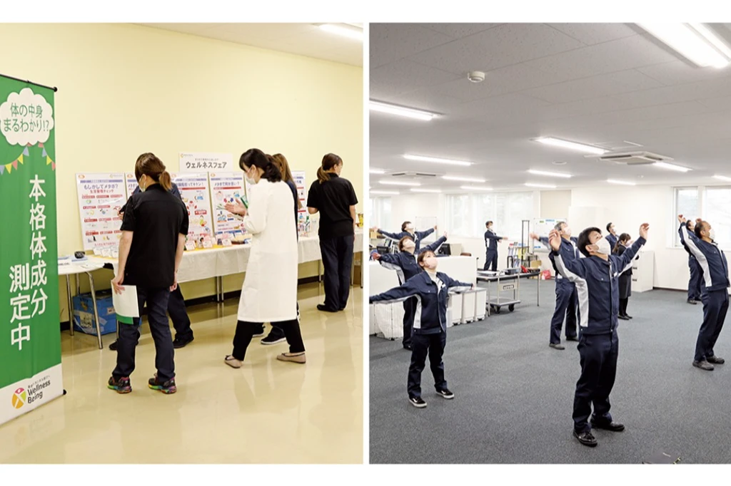 福利厚生面においては3事業所に社員食堂を設置し、栄養バランスの整った昼食を提供しています。曜日によってサラダや健康ドリンクなどを無償で提供しており、食に関するイベントを実施し食事面から社員の健康改善に取り組んでいます。