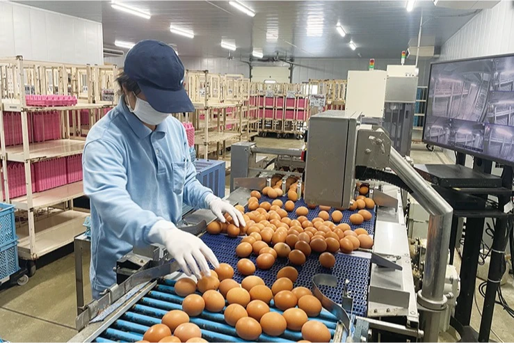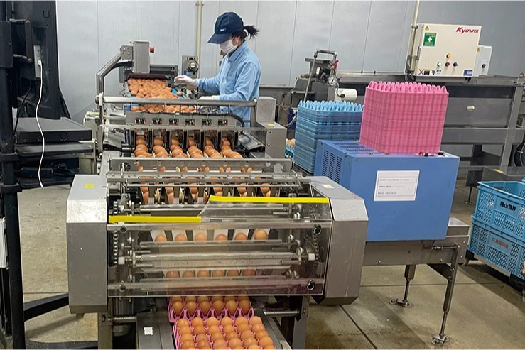 鶏舎から自動で運ばれてくるたまごを選別します。(割れたたまご・汚れたたまごを除去)1日の生産個数を記録し、生産状況を確認する