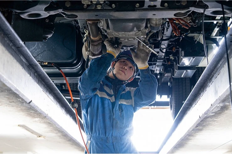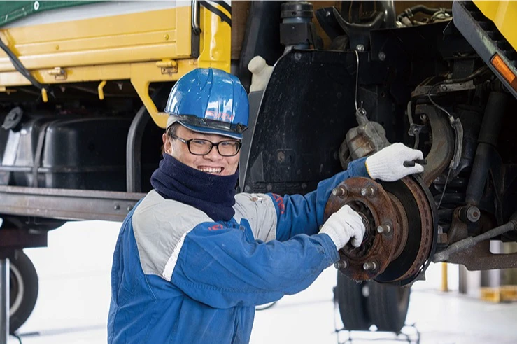 大型車両の整備はチームを組んで行います。作業を分担し、協力して効率的に整備を進めていきます。チーム内での情報共有と連携が、迅速で正確な作業を実現します。