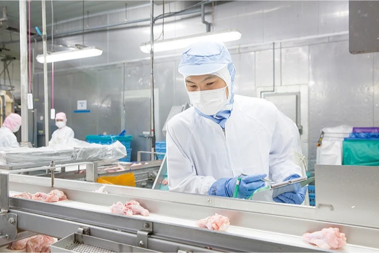 むね肉やもも肉、ささみやレバーなどスピーディーに解体するのは機械!骨や異物が残っていないか、最後は人の目と手で確認しています。