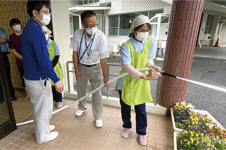 年2回の避難訓練を法人内の各事業所が合同で行います。災害時に入居者・利用者を安全に避難していただくため、全力で行います。