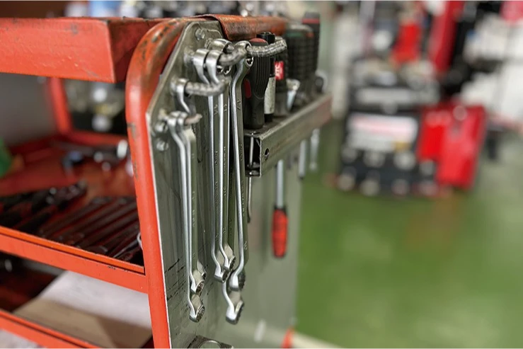 テクニカルスタッフには一人に1台、専用のツール&ワークテーブルがあるよ。ツール(工具)はいつもきれいに保ち整頓することで作業効率も上がるんだ!