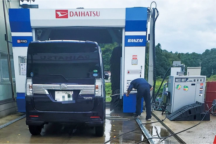洗車機導入で作業が効率化!以前の手洗い作業から進化し、すばやく美しい仕上がりが実現しました。スタッフの笑顔も溢れています。