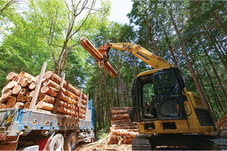 伐採現場からスピーディーかつ低コストで丸太を搬送。建築用材になる針葉樹の丸太は、 製材所へ。