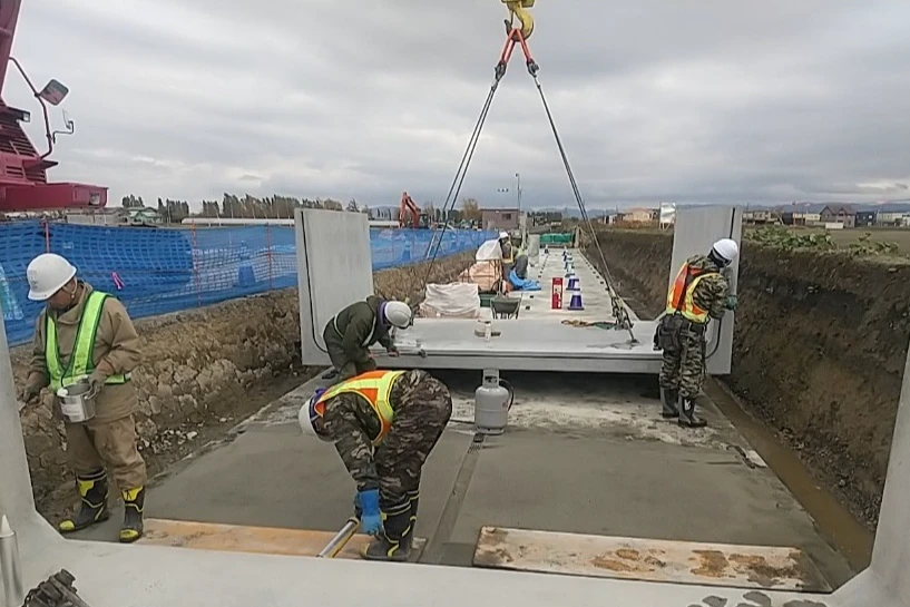 橋梁工事の下部及び上部工事や農業土木工事の開水路、管水路工事のほか、河川工事の鉄筋、足場、コンクリートなどの一連の工事を幅広く行っています。