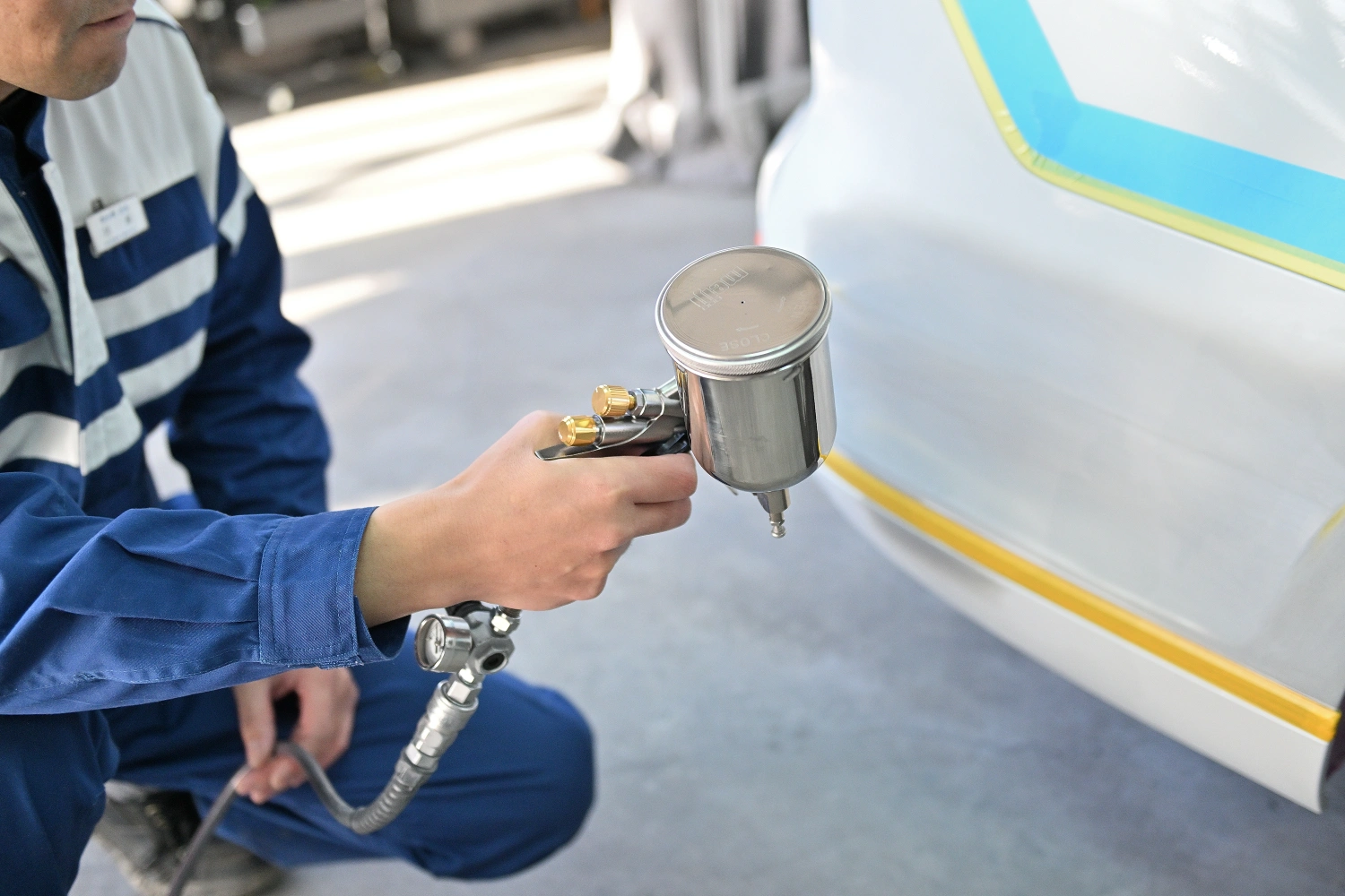整備課では主に、車検整備、点検整備、オイル交換やタイヤ交換等の一般整備を行います。車体課は、事故で損傷してしまった車の修理、キズや凹みの修理、経年劣化による外観の補修などです。