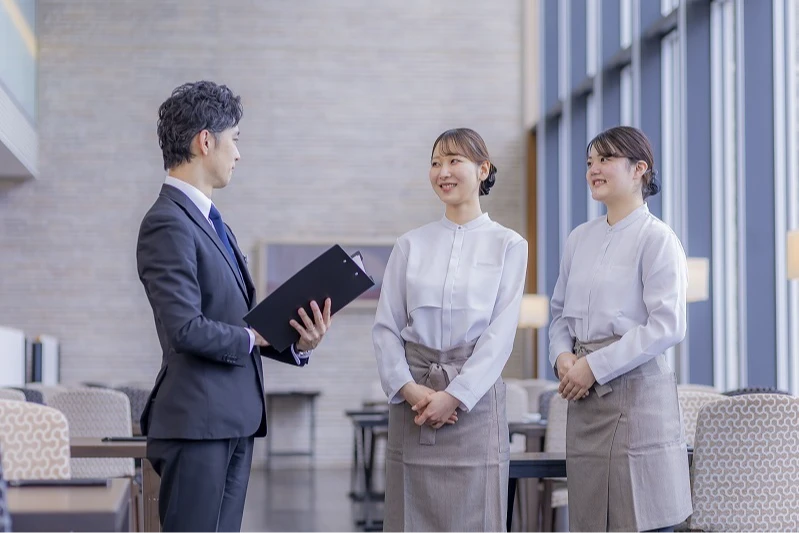サービス部門では、フロントでのご対応や電話応対、和食会席レストランでの料理提供などを通し、お客様に快適にお過ごしいただけるよう多方面からサポート。他、イベント企画やドリンクメニュー考案など、経験できる業務は多岐にわたります。細やかな心配りでお客様の「笑顔をつくるシゴト」が私たちの役割です。