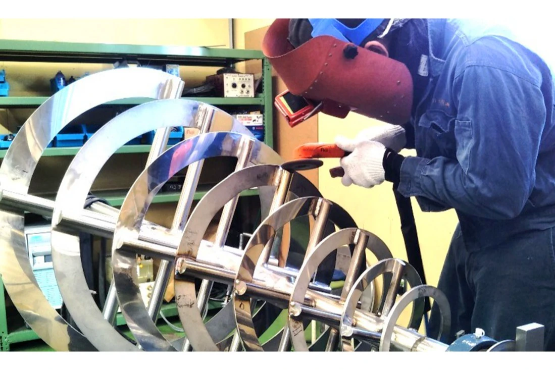 金属を曲げたり切ったり削ったり、研磨や溶接をして加工します。