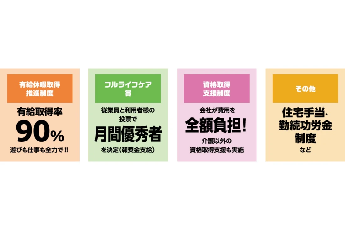 フルライフケアでのスタートに介護の経験や資格は必要ありません。入社後のチャレンジ精神や日々の取り組む姿勢を一番に評価する制度が充実しており、自分自身のペースで成長できる環境が整っています。