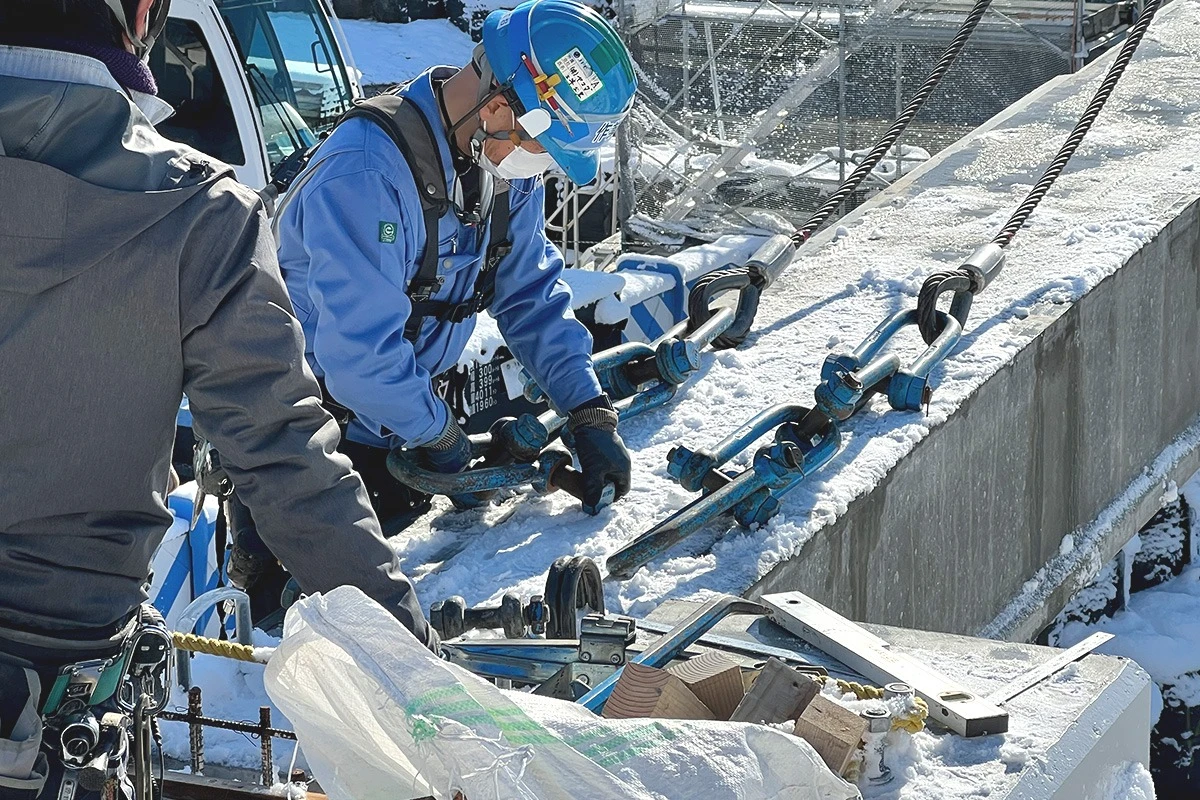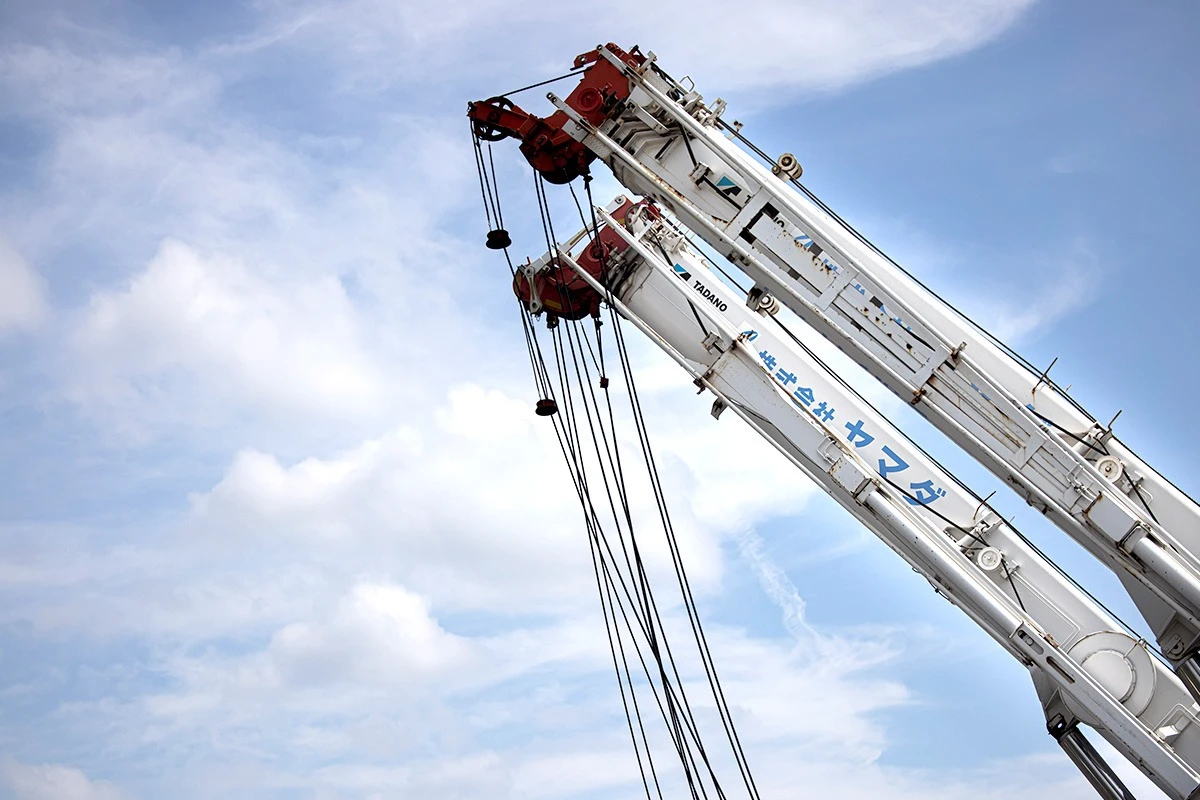 当社は、移動式クレーンで重量物の吊り上げ作業を行う「クレーン部門」、大型トレーラーで橋桁を運搬する「運輸部門」、重量物の撤去、据付作業を行う「工事部門」があり、その高い技術力で建設現場を支える専門工事会社です。人のチカラでは運べない超重量物を最新の機材や特殊なクレーンオペレーションを駆使し、安全かつ正確に撤去、据付、移動、運搬業務を行っています。