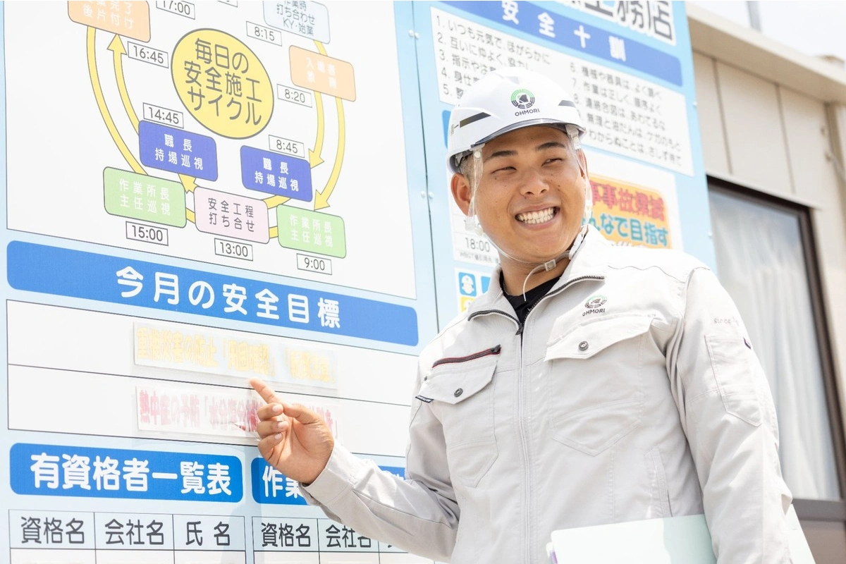 創業者・大森安治の信条である「人の世の信頼の大切さ」を受け継ぎ、「信頼・技術・信念」「初心忘るべからず」を社是に掲げ、安全第一でお客様にご満足いただける丁寧な仕事に取り組んでいます。