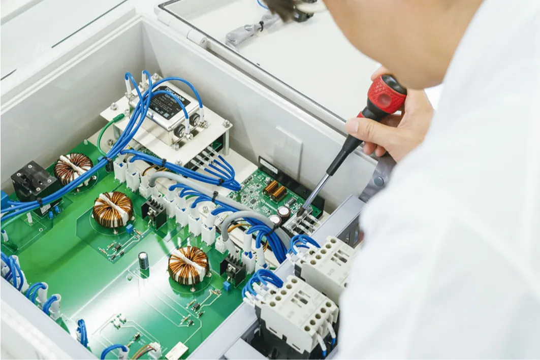 工場や建物に電気を安全に届ける高圧受電設備工事や機械を動かす頭脳となる制御盤の制作を主に行っています。