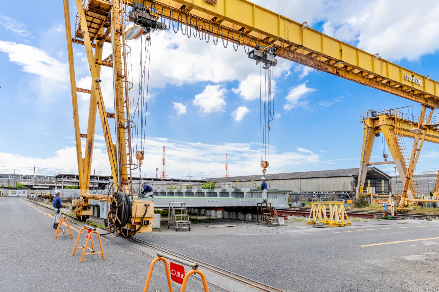 当社は、移動式クレーンで重量物の吊り上げ作業を行う「クレーン部門」、大型トレーラーで橋桁を運搬する「運輸部門」、重量物の撤去、据付作業を行う「工事部門」があり、その高い技術力で建設現場を支える専門工事会社です。人のチカラでは運べない超重量物を最新の機材や特殊なクレーンオペレーションを駆使し、安全かつ正確に撤去、据付、移動、運搬業務を行っています。