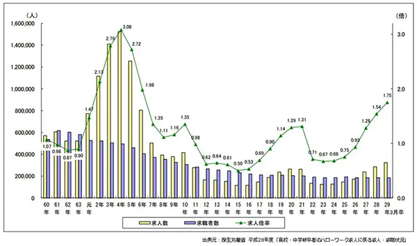 - 倍率が1.0以上:就職を希望する高校生の数よりも高校生を採用したい企業数の方が多く、内定を獲得しやすい