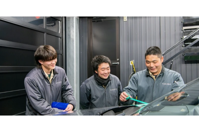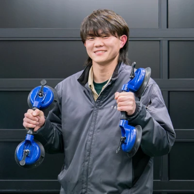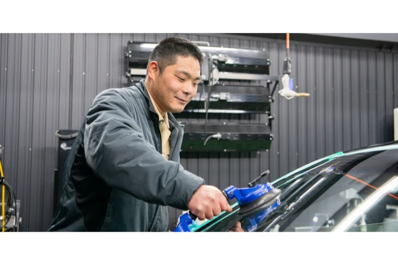 依頼を受けてガラスや部品を準備し、お得意様の工場へ出張して作業を行います。車によって難易度が全然違うので、初めのうちは先輩のサポートしかできないと思います。しかし2年3年と経験を積んでいくと、いつの間にか先輩と同じような作業が出来るようになっている自分がいます。当然、先輩は次のステージへ行っているので、いつまでも追いつけないのですが、その繰り返しが当社の強みです。全員が、次から次へと成長し続けることでチームワークや信頼関係が生まれ個々にレベルアップしていくのです。