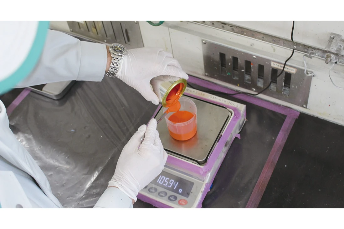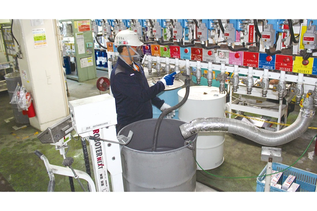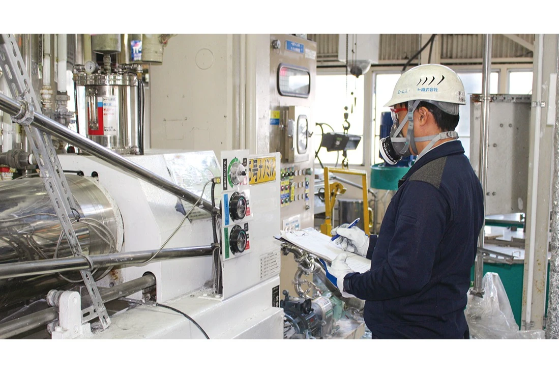 作業手順書を基に、原料収集→仕込み→分散→溶解→充填の各工程を各担当者が行います。