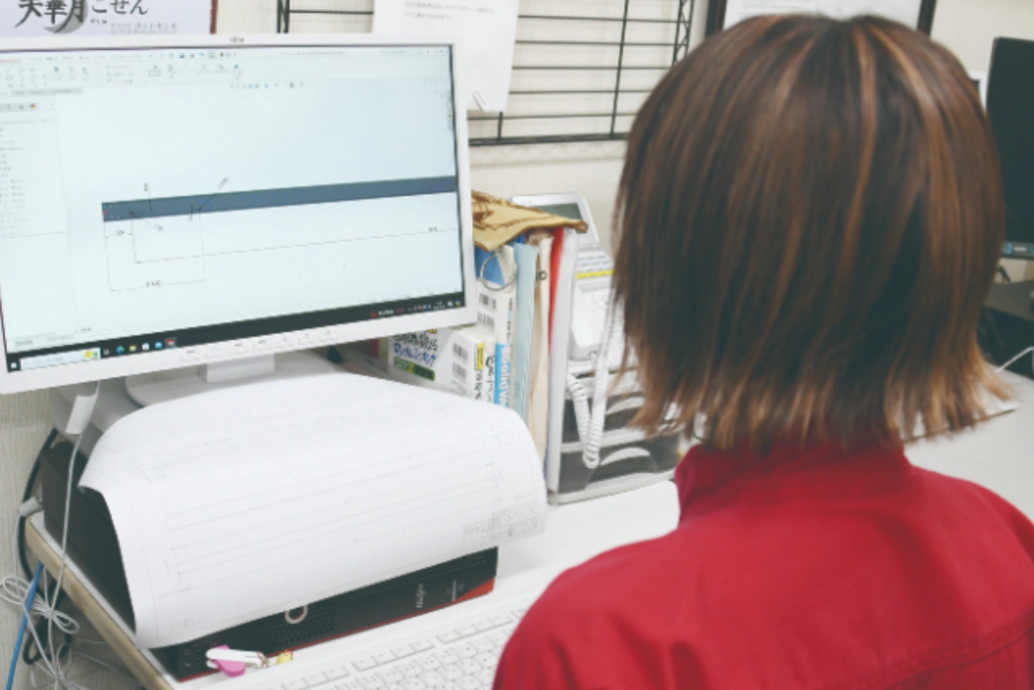お客さまからの依頼内容を詳細な図面に起こす仕事です。専用のソフトを使用し、実際にレーザー加工ができるよう、精密なデータを作成します。作成には、早くて5 分、複雑なものでは1~ 2 時間かかることもあります。高い技術力と集中力で、質の高い製品づくりをしています。