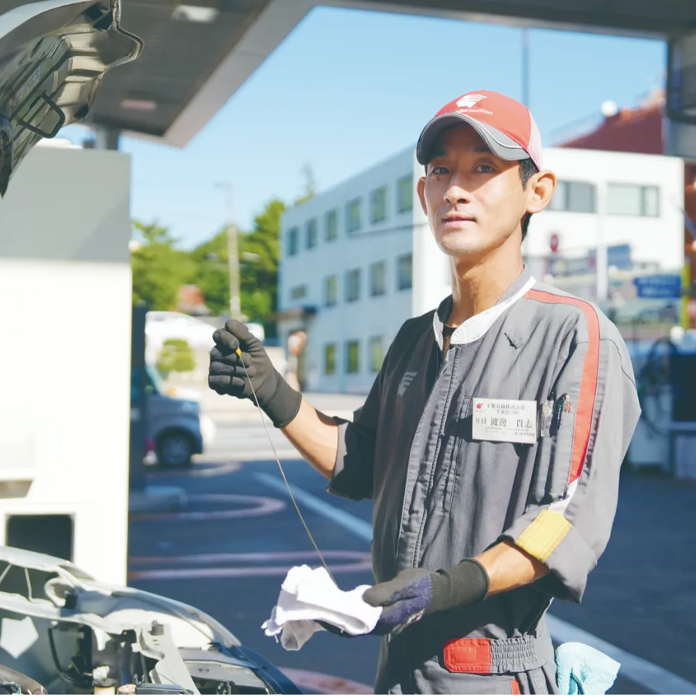 当社では、スタッフに長く働いていただくため、資格取得やスキルアップをサポートしています。例えば、入社後には「危険物取扱者」や「自動車整備士」などの資格を取得していただくための研修制度を完備。また、お客さまと接することで、正しい言葉遣いや提案力、接客スキルが自然と身に付きます。そして、永年勤続制度として、長年勤めてくださったスタッフに表彰を行なっています。