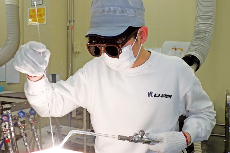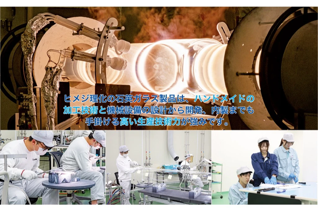 ヒメジ理化株式会社は、石英ガラスを主体としたモノづくりの企業です。当社が作る高精度かつ高精度かつ高純度な石英ガラス製品は、近年の需要はますます高まりつつあります。半導体をはじめLEDや太陽電池、液晶パネルの製造プロセスなど幅広い業界で使用されています。世界の最先端技術になくてはならない部品を作る存在で、世界的に注目を集めている最新スマホやデジタルインフラ、自動車にも当社の製品が関わっています。