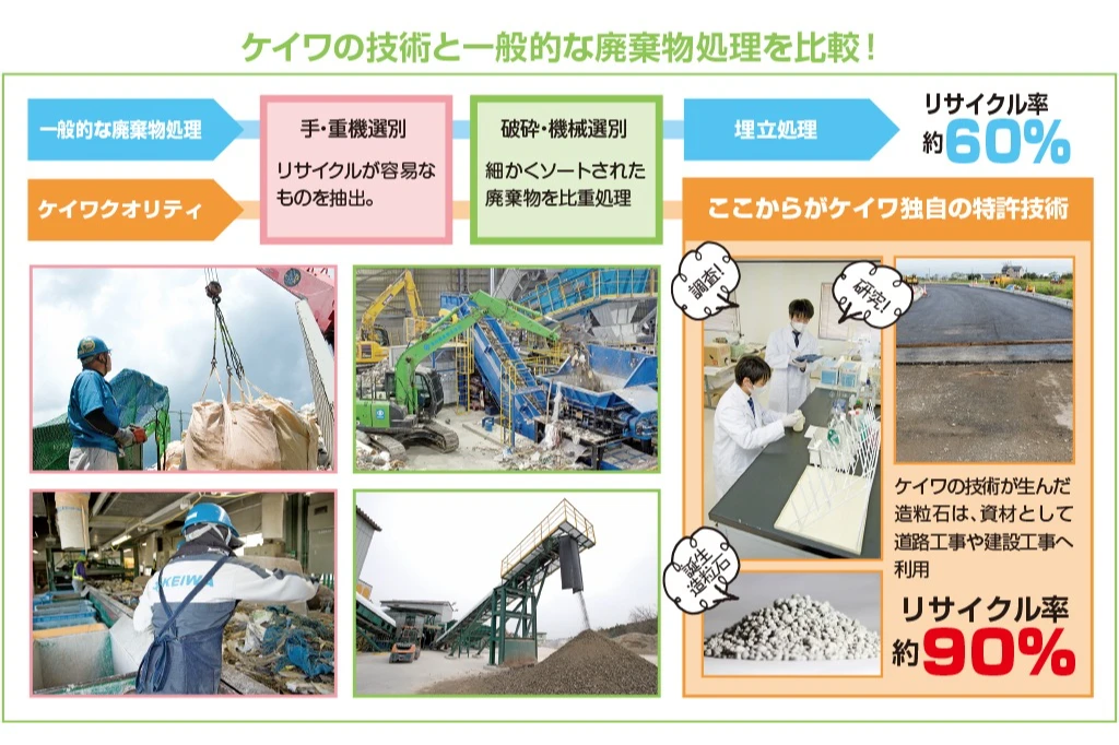 恵和興業は学習塾運営を目的に1977年に設立され、不動産業、飲食業など業態を転換しながら地域に役立てる方法を探してまいりました。その後安定型埋立処分場の運営を開始、時代の流れとともにリサイクルへ舵を切り、現在の産業廃棄物の中間処理を行うようになりました。また、恵和興業の100%子会社であるケイワ・エコグリーンでは産業廃棄物の収集運搬を業とし、ケイワグループ一丸となり持続可能な社会への貢献を続けております。