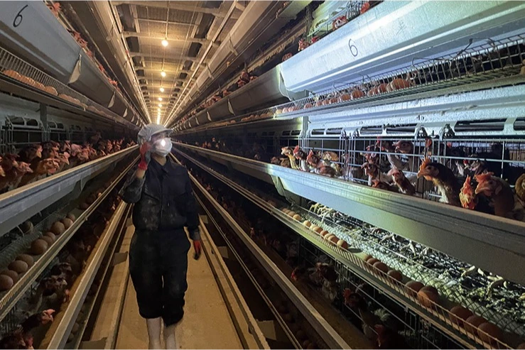 朝の鶏舎内管理。えさの量・水の量の確認は勿論、鶏の見廻りが一番大切な仕事です。(鶏の健康状況チェック)