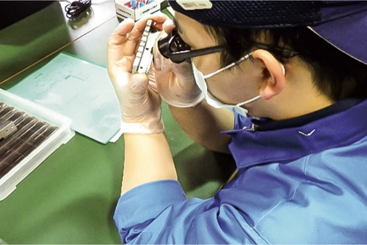 三次工場では、注射器をはじめ注射針、栄養カテーテル、人工透析用翼状針など多種多様な製品を生産しています。中でも医療機器に組み込まれるステンレス製の針管を、板状の材料からパイプにし、用途に応じた規格の外径に加工します。さらに先端を鋭利に研磨し、洗浄、検査を経て針管が完成します。この針管を国内工場、海外工場へ供給しており、それぞれの工場で最終製品となる医療機器へ組み込んでいます。