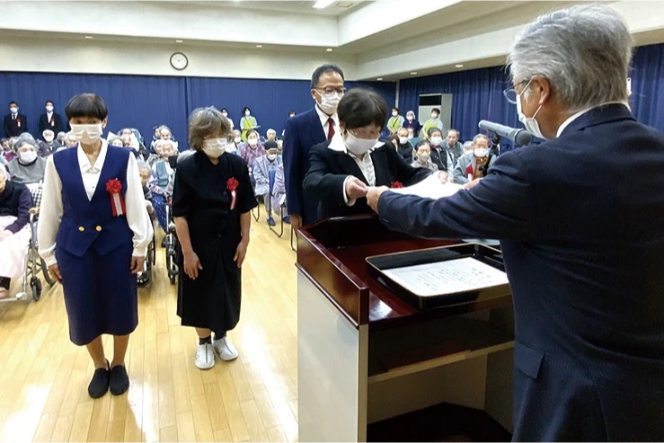 永年勤続し、勤務成績が優秀で模範となる職員に5年ごとの表彰が行われます。永年勤続表彰35年のベテラン職員がいます。