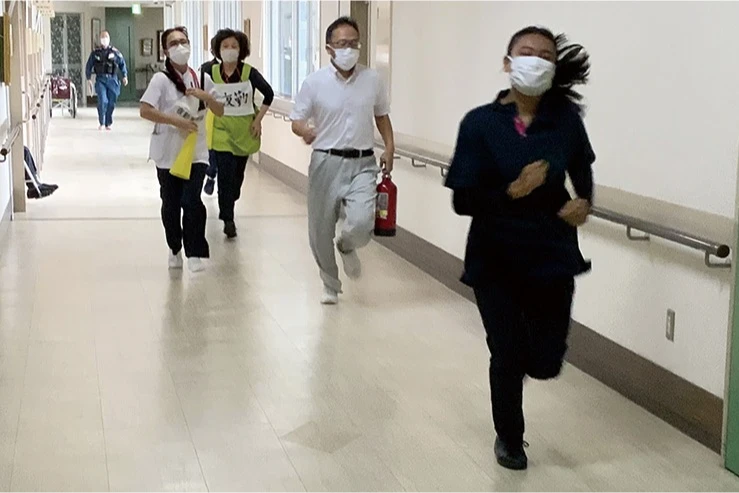 年2回の避難訓練を法人内の各事業所が合同で行います。災害時に入居者・利用者を安全に避難していただくため、全力で行います。