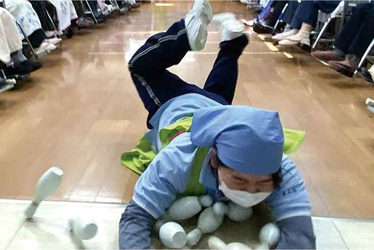 入居者のボーリング大会ですが、職員も体を張って楽しみます。入居者の方も職員の意外な一面を楽しみにされています。