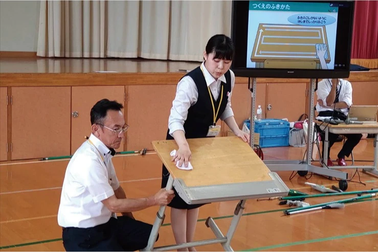 地域の小学生にほうきや雑巾の使い方を実践し、快適、長持ち、健康をテーマに授業を行います。先生方と一緒になってお掃除の時間を使った生活の力をつくるお手伝いを毎年実施しています。累計の受講者はこの8年間で8,731名になりました。