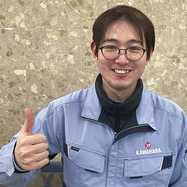 私は県外の大学を卒業後に、地元で就職したいと思い河原に入社しました。入社後半年間の現場研修でリフトテーブルに触れ、その後設計業務を担当しています。優しい先輩方に教わりながら、自分にできることが増えるのをモチベーションに、一から機械設計を行っています。 毎週水曜日はノー残業デーとなっており、働き方改革にも会社全体で取り組んでいます!!