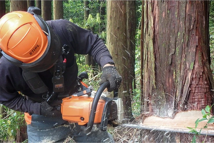 林業においての作業は何一つ同じ状況はありません!疑似体験をする事で危険からの回避を学び、判断能力の向上に役立つよう不定期で実施しています。