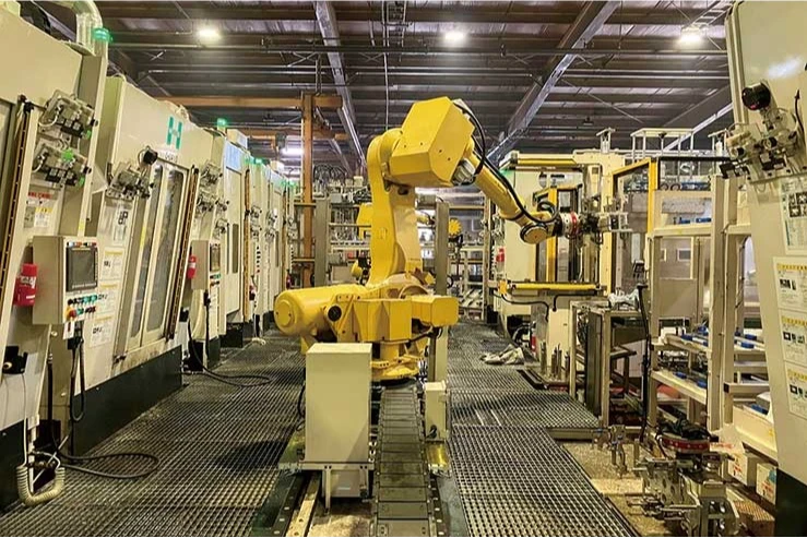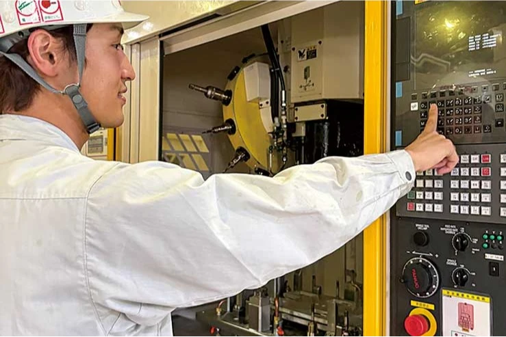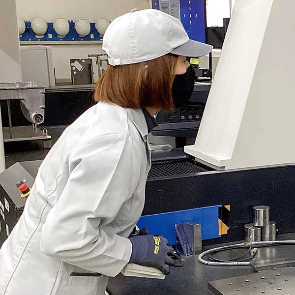 加工部門では、製品の状態を確認し、加工機ラインへ製品を投入します。加工機ラインでは、製品の研磨、穴あけなどを行っています。