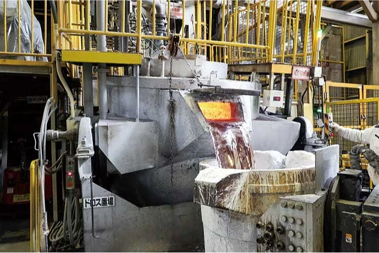 合金部門ではアルミニウムの塊を溶かして液体にしたもの(約720℃)を、必要な量・必要なだけ鋳造部門に届けます。