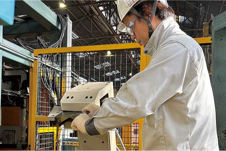 鋳造部門では、製品を作るための金型を取り付けたり、出来上がった製品の周りについている余分なもの(バリ)を取り除いています。