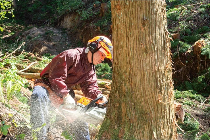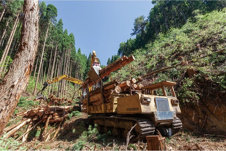 依頼を受けて、山の状況を確認しチェーンソーで伐採します。枝払いをし、3〜4mの長さの丸太に専用の機械でカット。丸太は重機を使って、運搬トラックが入れる場所まで運びます。