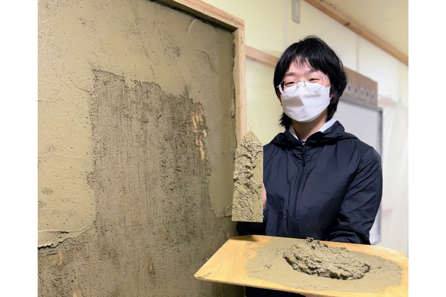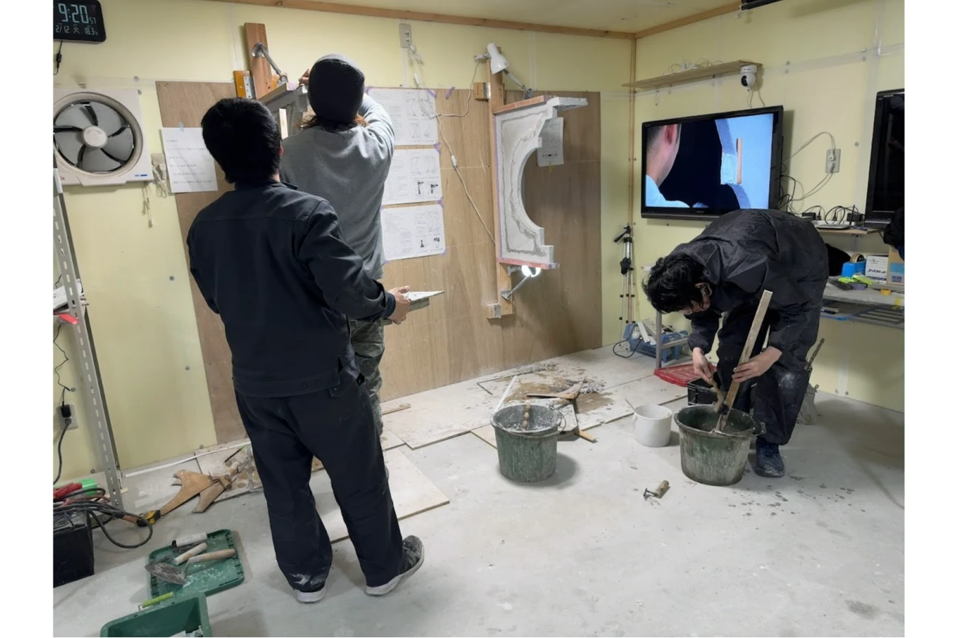 研修の主となる「塗り壁トレーニング」は、実際に高い技術の職人が壁を塗る動画を見て学ぶ練習法です。さらに、自分が塗る姿を撮影し、その映像と見比べて自ら修正していくことで腕を磨いていきます。この動画教育は「モデリング」といって、スポーツ選手の育成などで取り入れられている教育方法で過去の実績があるものです。モデリングを活用した教育を行うことができる環境が整っているのが当社の強みです。