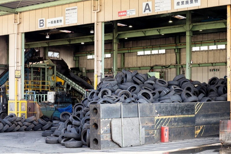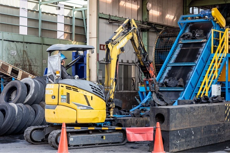 回収されたタイヤは当社の工場で検品・仕分けされ、破砕機などを用いて切断・破砕処理が行われます。
