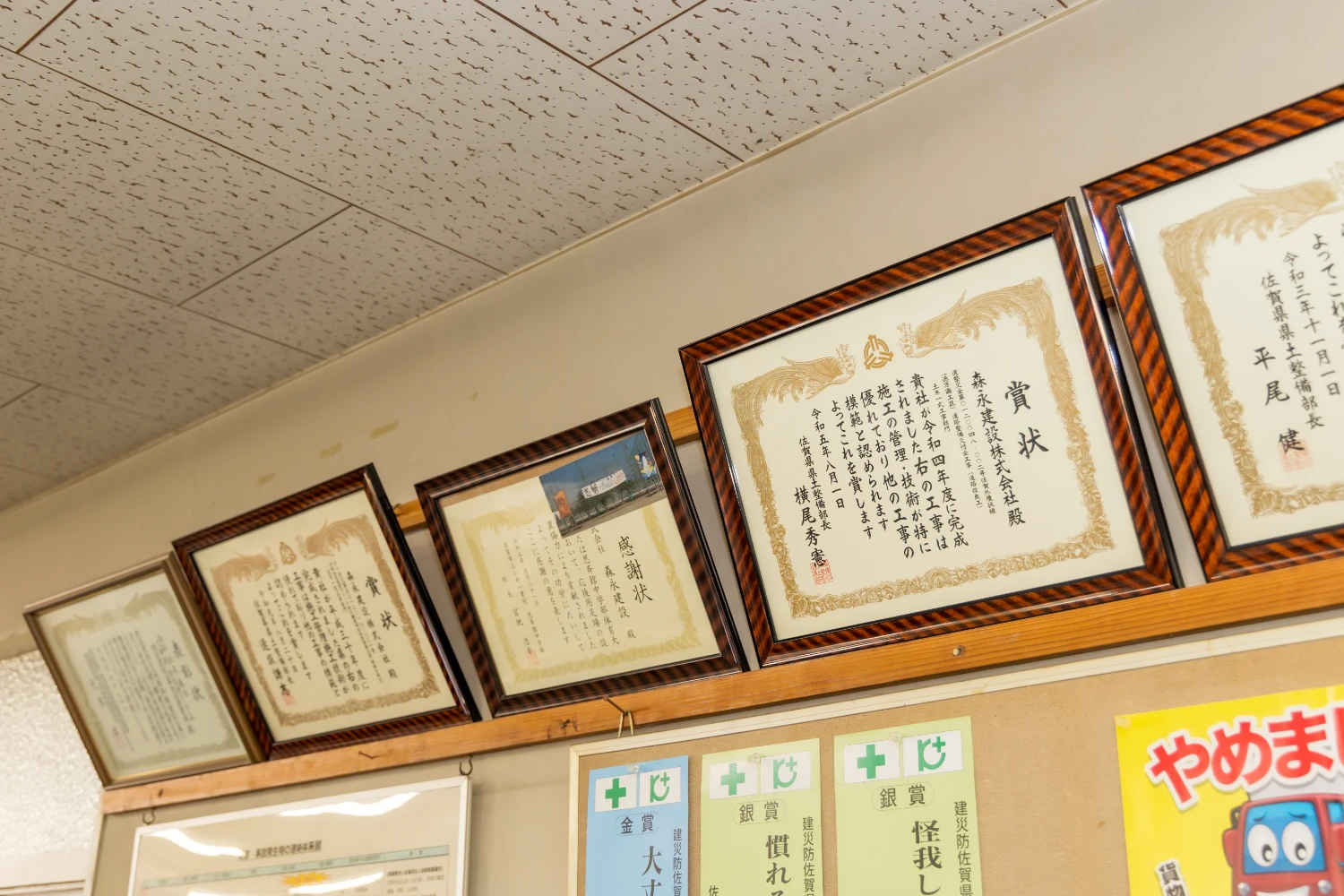 創業から130年以上、たくさんの表彰をいただいてきました。工事成績優秀表彰のほか、防災や清掃活動など、地域への貢献も大事にしてきました。