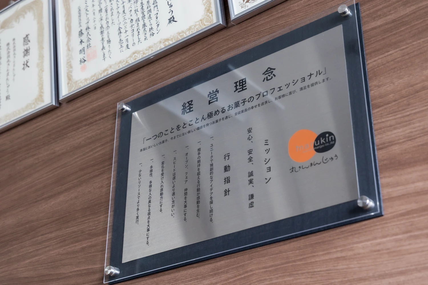 創業から変わらず、甘味で人を笑顔にしたいという思いでお菓子を製造しています。1つのお菓子が出来上がるまでに、様々な部署が関わり知恵を出し合い、良いことも悪いこともみんなで分かち合って、成長し続ける、それが丸きんまんじゅうです。