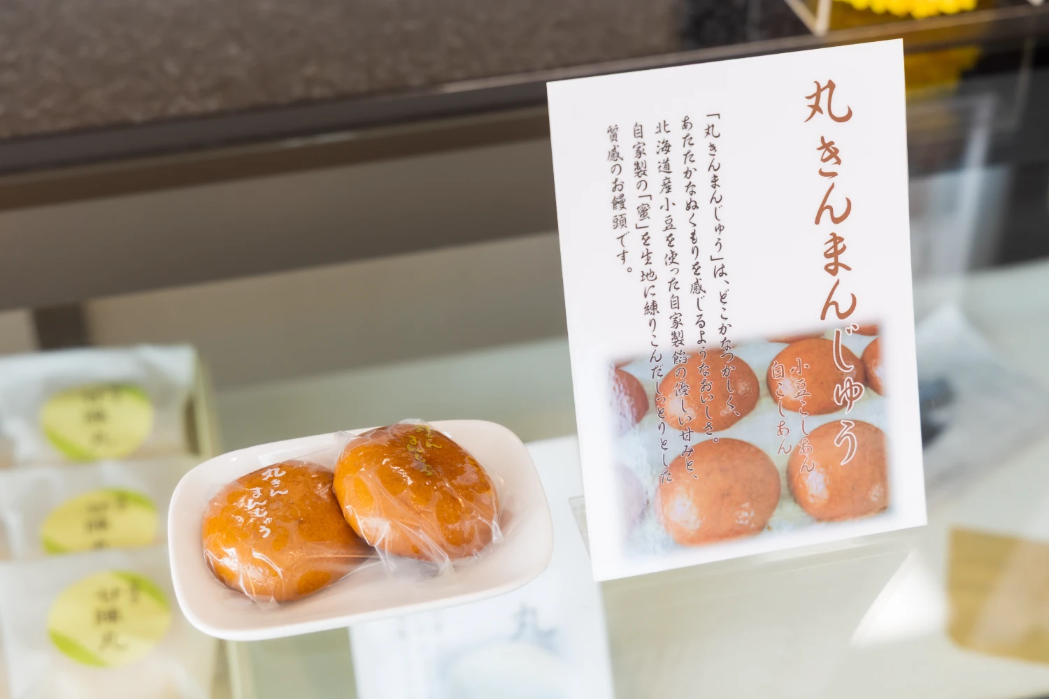 本社に併設する直営店「甘陣屋」で販売しているその名の通り「丸きんまんじゅう」です。香ばしい焦げ蜜生地でこしあんを包みました。季節に応じた商品もたくさんあります。