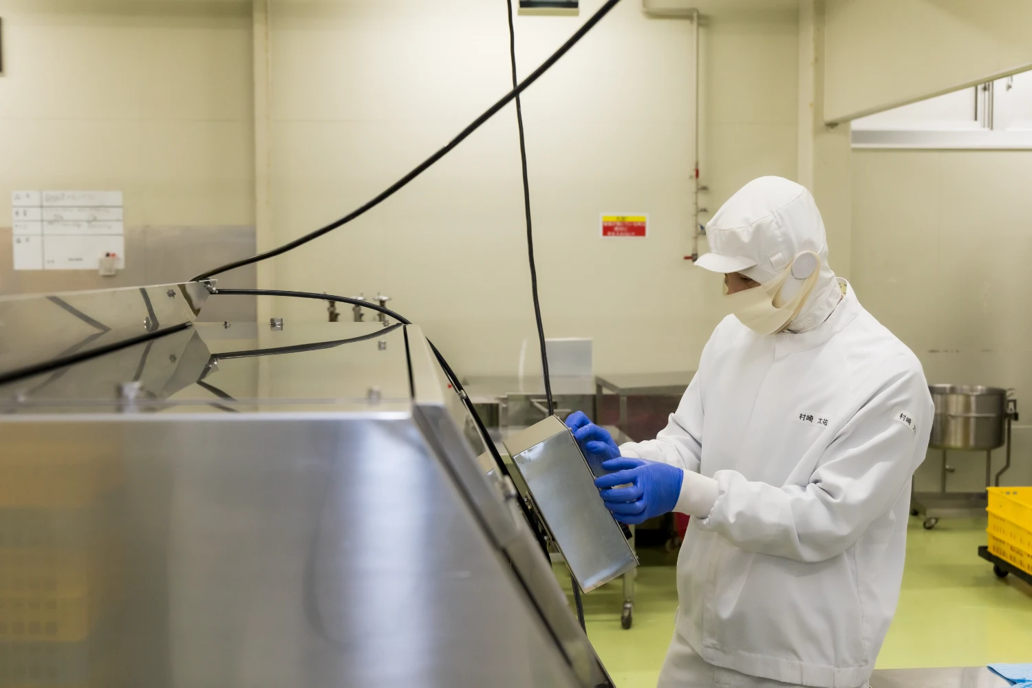 ロールケーキのカットサイズを調整しているところです。機械の組み立てや分解の仕方、操作も一から教えます。