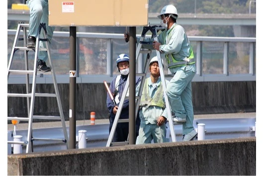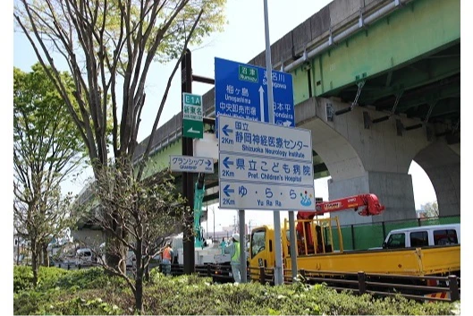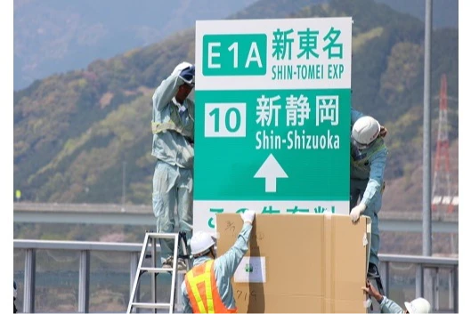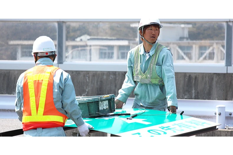 大型標識は、クレーンと高所作業車を使って設置します。標識は、走行中のドライバーが見やすいよう1文字が30cmで、反射シートで作られています。