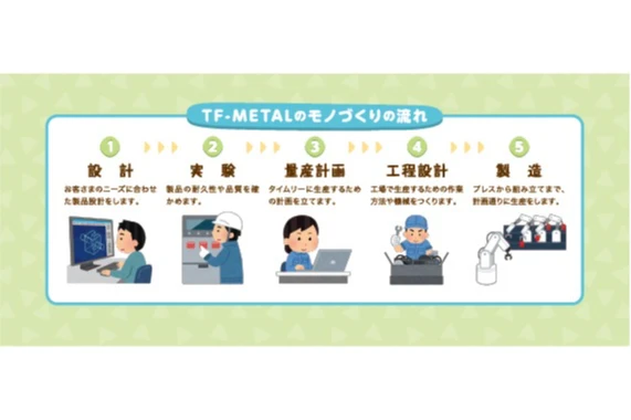 TF-METALは、自動車用シート機構部品の設計・開発から組立までの一貫生産体制を整え、ビジネスを展開しています。お客さまは、国内外の主要カーメーカーです。 近年の自動車業界は、かつて経験した事のない大きな変革期を迎えています。その中で「技術の創造」を追い求め、価値ある製品を提案・提供し続けています。 若い社員が主体となり、誰からも”いいね!”と言われる製品づくりに取り組み、明るく、活気あふれた職場です。チャレンジ精神のあるみなさんと一緒に仕事ができることを楽しみに、社員一同、心よりみなさんのご入社をお待ちしております。