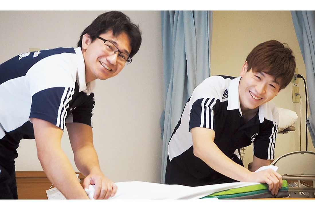 療養にふさわしい環境の中で医師・介護支援専門員・理学療法士・言語聴覚士・支援相談員・看護師・介護士が一体となってお年寄りの残存能力の維持、日常生活動作能力の改善のための訓練を行い、自助・自立能力を高め、より早く明るい家庭生活を営めるよう個別の施設介護サービス計画(ケアプラン)により療養していただきます(短期入所療養介護は要支援以上)。